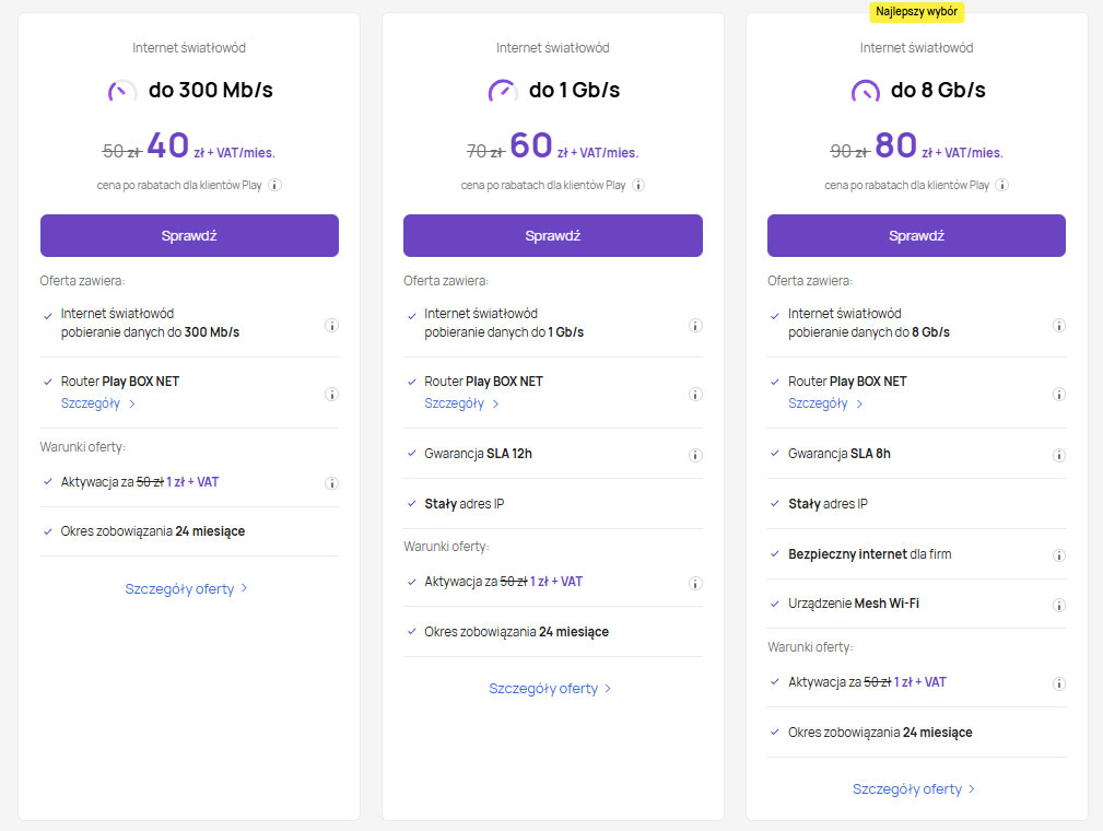 Jak widać, wariant ULTRA zawiera wszystko, co może być przydatne nowoczesnej firmie. Niewiele wolniejszy pakiet PRO (1 Gb/s) także zapewnia kluczowe udogodnienia – stały adres IP oraz gwarantowany czas naprawy w ramach SLA do 12 godzin w cenie abonamentu. To oznacza, że nawet wybierając średni pakiet, firma zyskuje własny stały adres w sieci oraz obietnicę szybkiej reakcji serwisowej (12h) w razie awarii. W najtańszym wariancie 300 Mb/s takich dodatków brak w standardzie, lecz przedsiębiorca może je dokupić opcjonalnie, jeśli są potrzebne. W każdym pakiecie Play zapewnia za to nowoczesny router Wi‑Fi 6 (Play Box Net) z czterema gigabitowymi portami Ethernet, co stanowi solidną bazę do stworzenia wydajnej sieci firmowej.